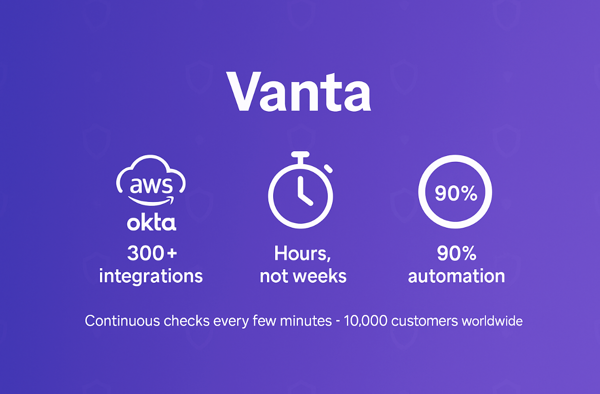 Scale backs the claim: Vanta now serves 10,000 customers worldwide and can automate up to 90 percent of the work required for frameworks such as SOC 2 and ISO 27001. In one case study, Modern Health cut 100 hours of annual compliance work and reduced evidence collection from months to under a week.