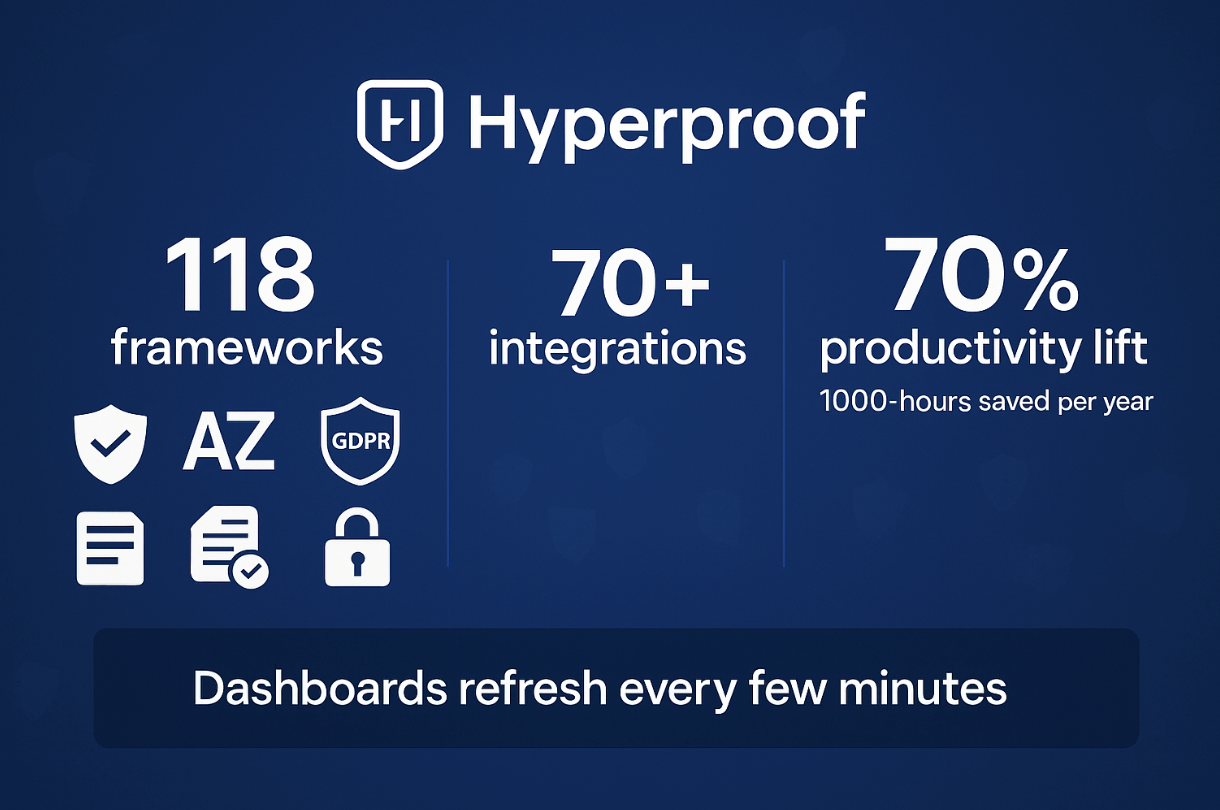 Dashboards refresh every few minutes, and built-in alerts flag an expired policy or missing MFA well before an auditor can. Customers report a 70 percent productivity lift for security and compliance teams and save over 1,000 staff-hours each year on evidence work.