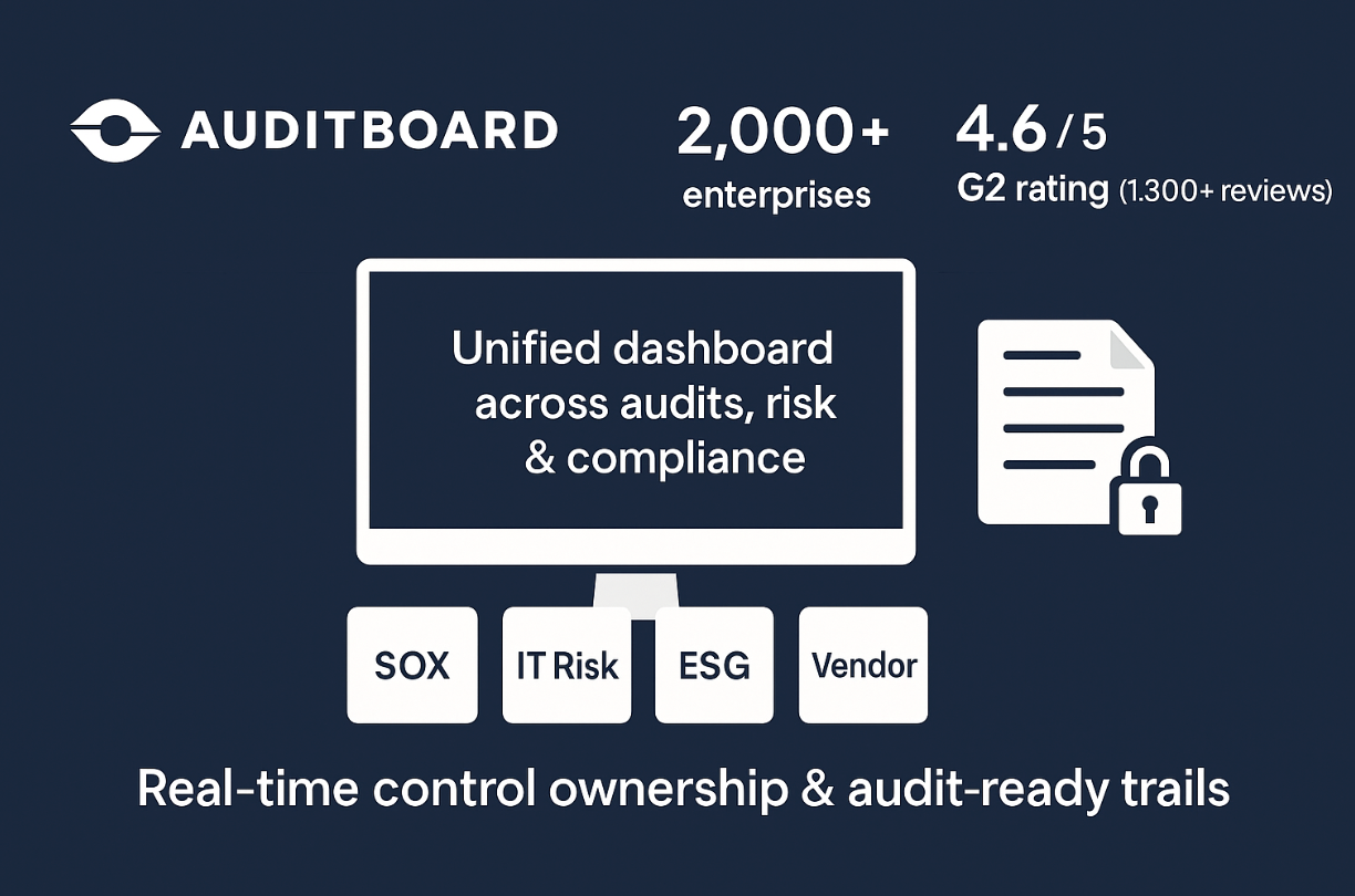AuditBoard serves large enterprises that juggle audits, risk, and compliance across many business units. More than 2,000 organizations rely on the platform, and it holds a 4.6 / 5 rating from over 1,300 G2 reviews.