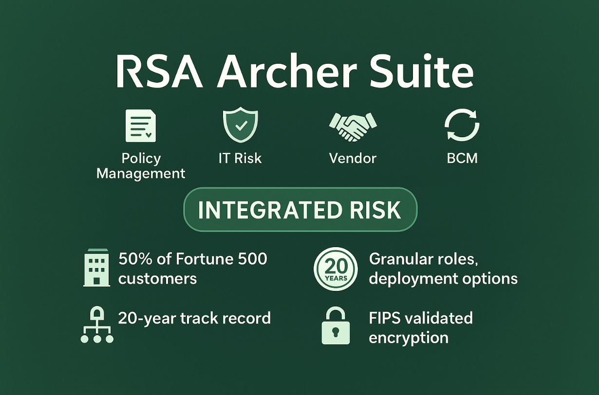 Its strength is breadth. You can deploy modules for policy management, IT risk, vendor oversight, and business continuity on one data model, so executives view enterprise risk through a single lens.
