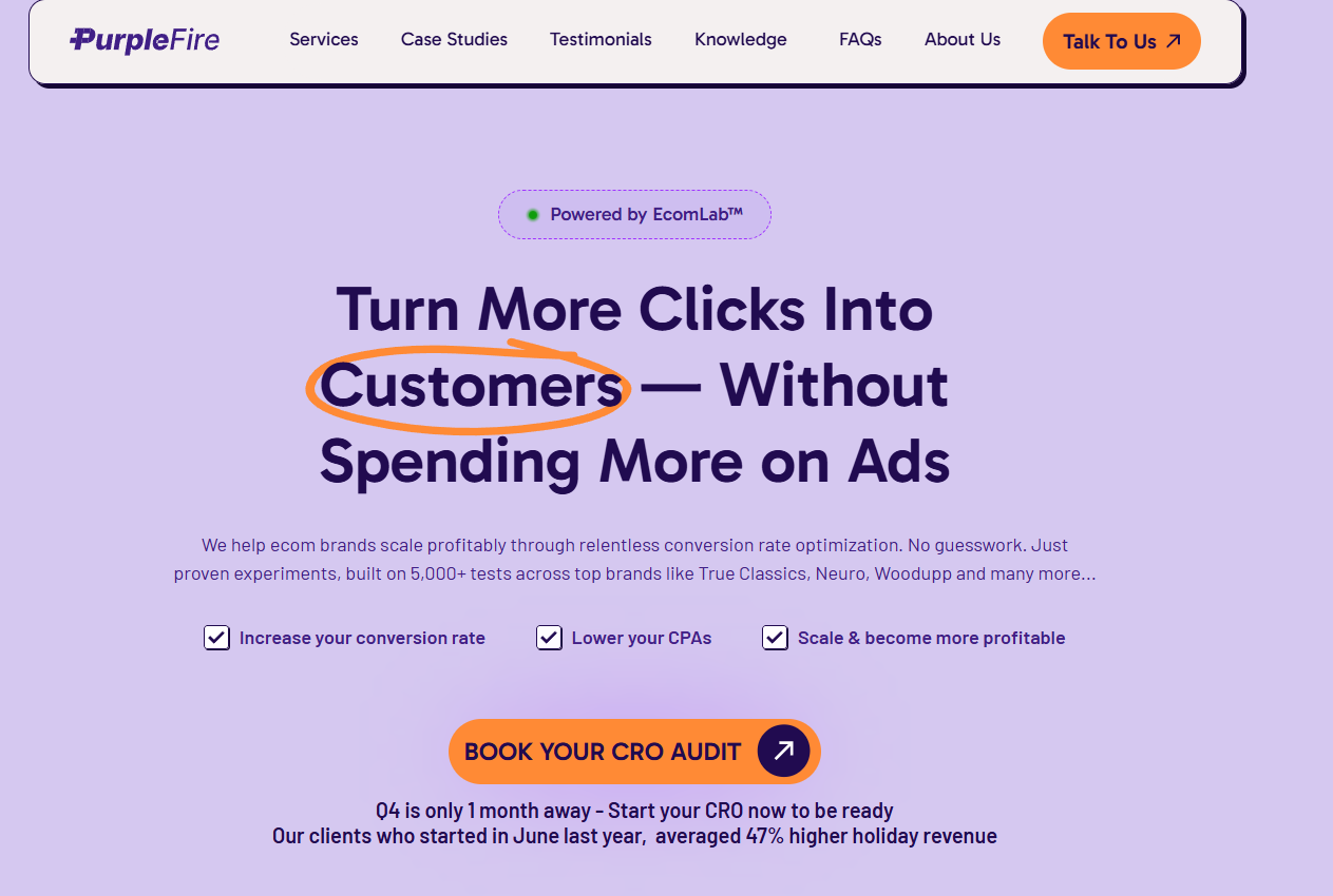 For Shopify Plus merchants, PurpleFire can take on ambitious experimentation roadmaps, rolling out multiple tests per week to accelerate learning. They cover everything on your store: from homepage design tweaks to optimized subscription flows, always with a sharp focus on ROI. Their emphasis on quick turnarounds and measurable results makes them a go to for Shopify stores with aggressive growth targets.