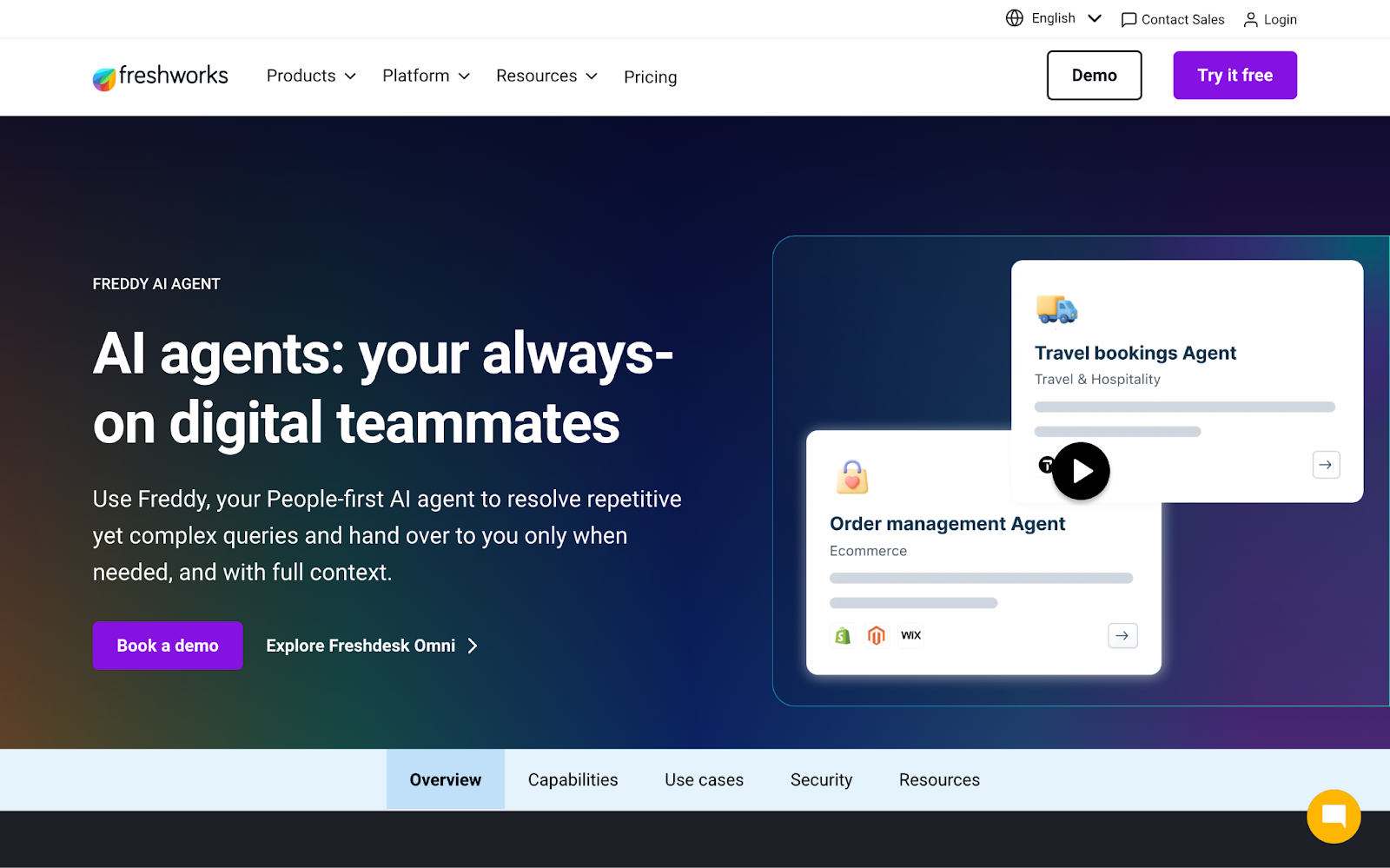 Freddy AI Agent is Freshworks' people-first AI solution designed to resolve repetitive yet complex queries while handing over conversations to human agents only when needed, with full context transferred. It functions as an always-on digital teammate that automates support across multiple channels including email, webchat, WhatsApp, and social platforms.