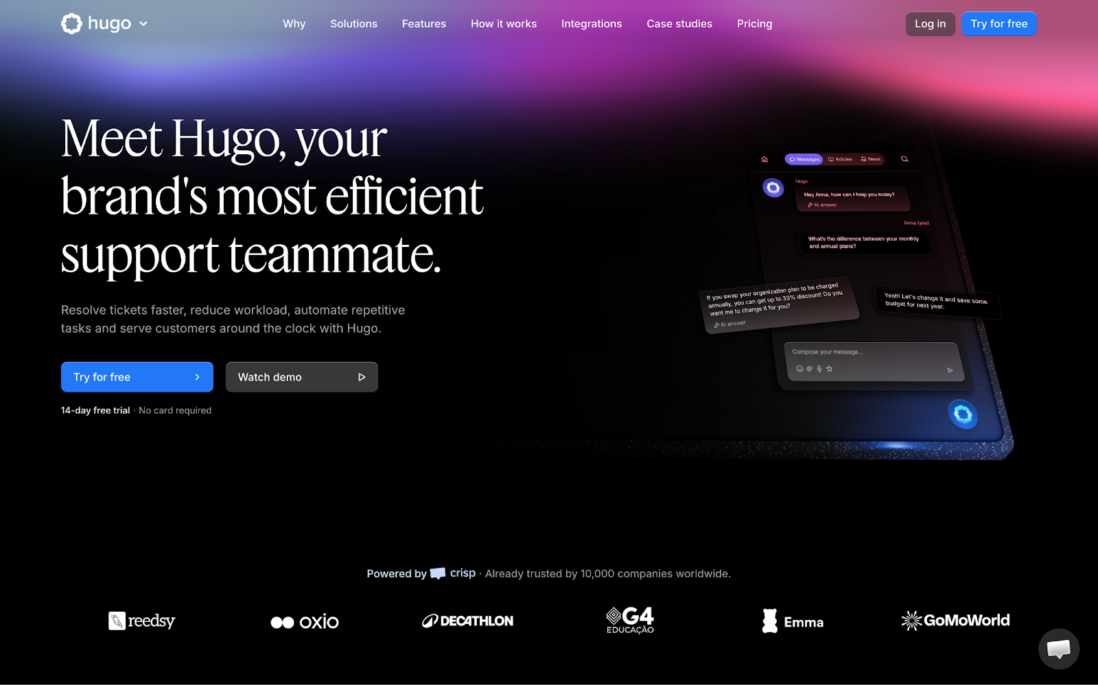 Hugo adapts to your specific support workflows through customizable routing rules and behavior settings that align with your team's communication standards. It continuously learns from interactions to improve response quality while tracking performance metrics that show exactly how automation impacts your operations, helping you identify where to optimize further.