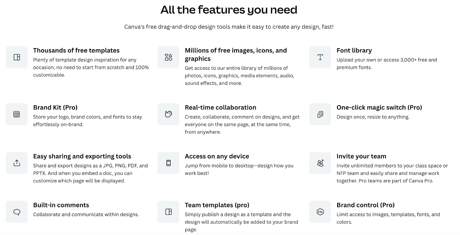 | Canva | All-in-one design needs | Yes | ~$13/month |