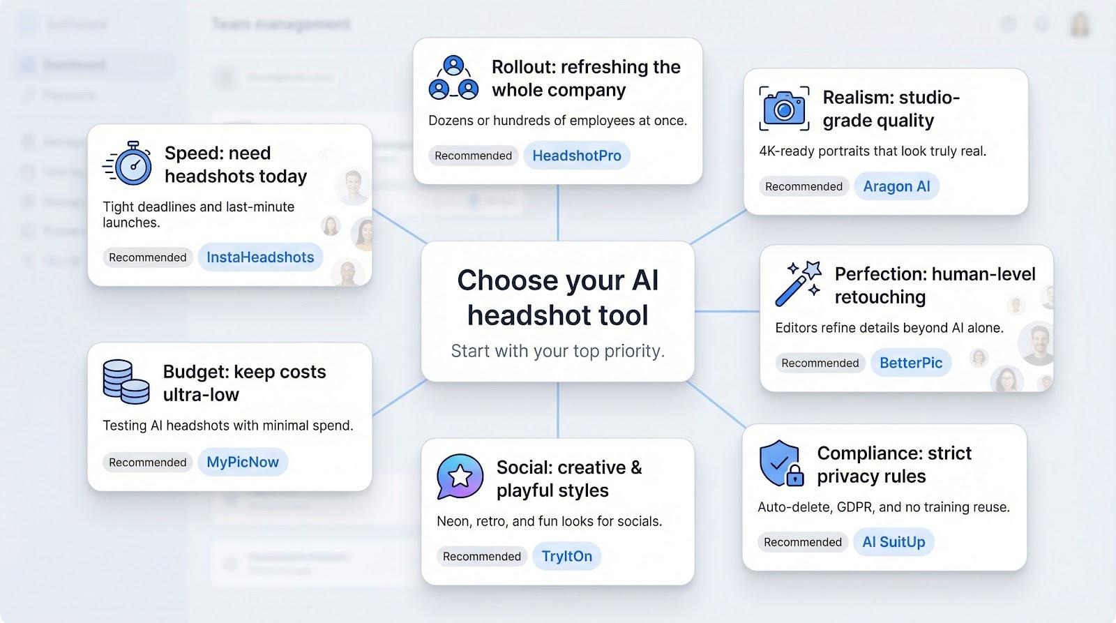 | InstaHeadshots | Last-minute launches | Bulk dashboard, style lock | ≈ 15 min | $49 / 40 shots | Auto-delete after 30 days |