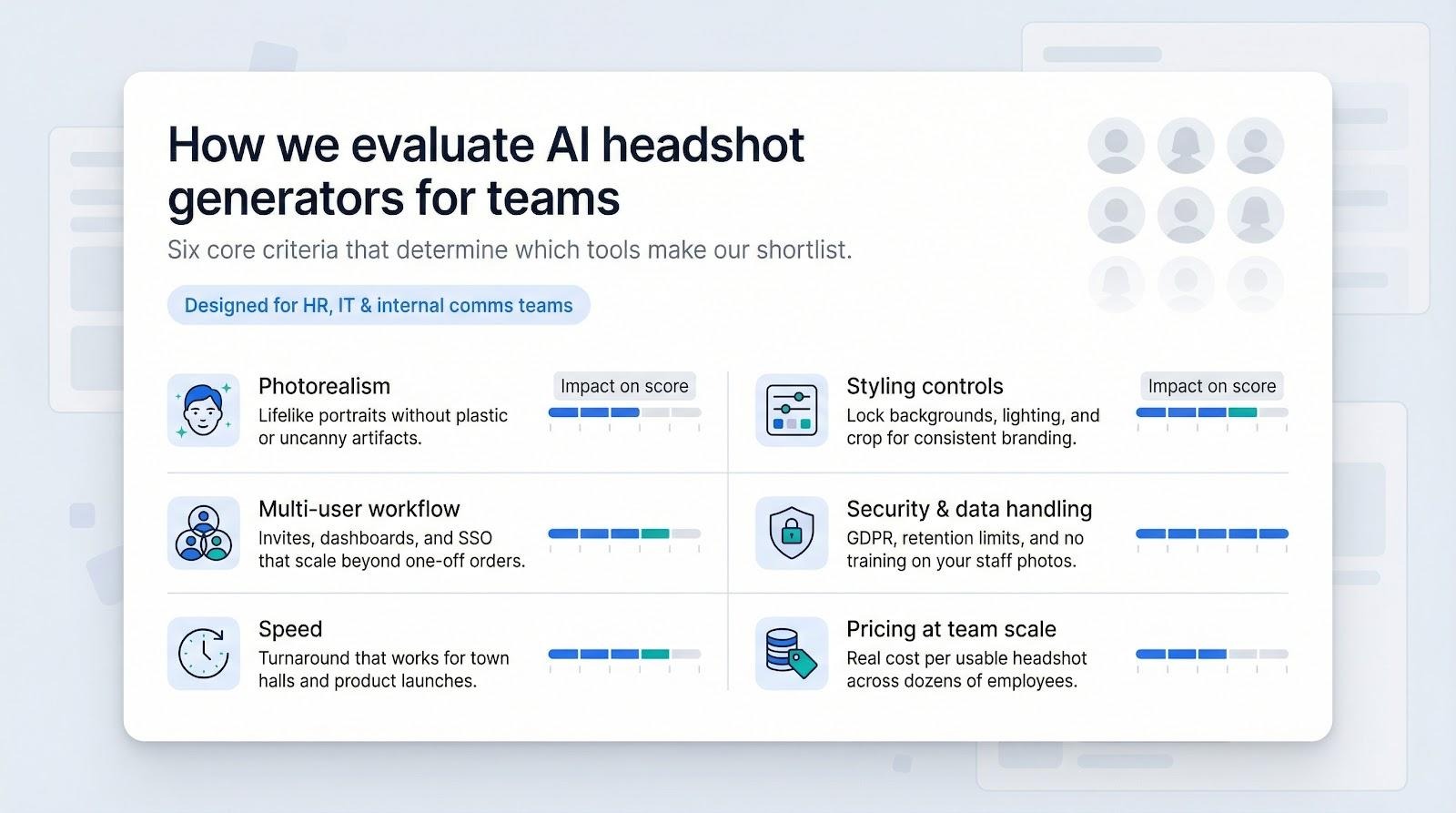 We scored every result on a seven-point rubric. First came photorealism: does the finished portrait look like the person in good daylight, or does it slip into plastic-doll territory? We then checked styling controls. A generator earns top marks only if you can lock background color, lighting, and framing so every profile on your org chart feels like one cohesive shoot.