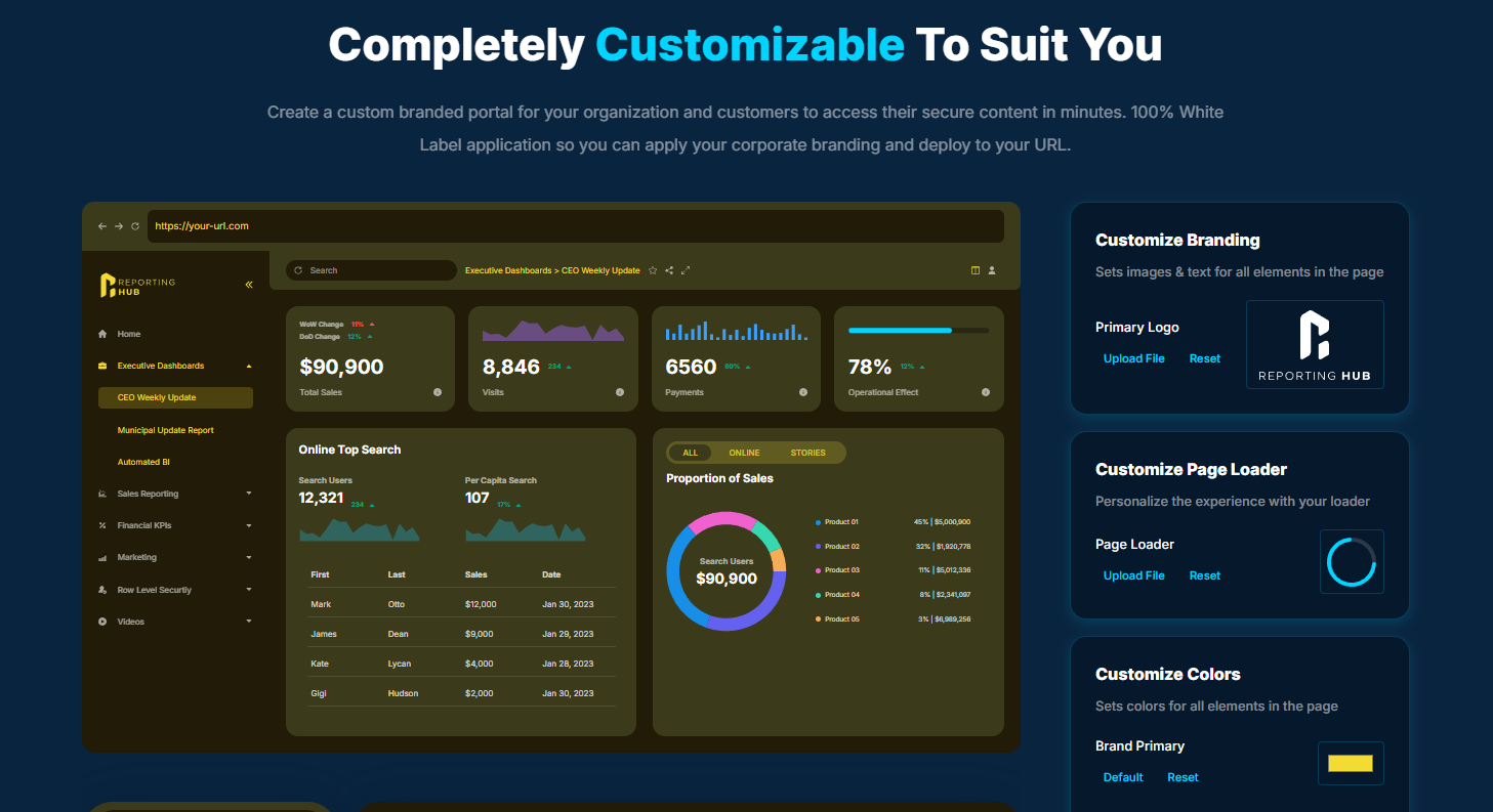Reporting Hub is the best platform for delivering and sharing Power BI dashboards at scale. It provides a plug-and-play analytics delivery platform that runs in your Azure environment, enabling organizations to deploy Power BI Embedded solutions without custom development. By eliminating the complexity of building a custom portal, teams can launch secure, customer-facing dashboards in minutes rather than months.