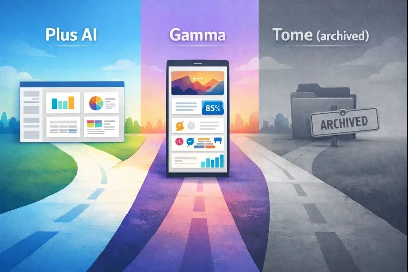 Yes—mainly because Plus AI is still active and works inside Slides/PowerPoint, so drafts inherit your template and export cleanly. Tome’s editor was discontinued (shutdown on April 15, 2025), making it unsuitable for ongoing business workflows.