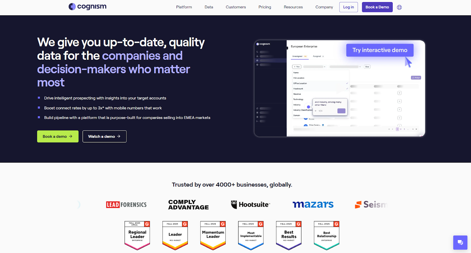 Cognism is an great choice for teams that prioritize high-quality data and direct access to decision-makers. Its Diamond Data is known for being consistently refreshed and highly accurate, giving sales teams confidence that they’re reaching real, active prospects. With this tool, you also get 90% coverage of director-level and above contacts across Europe and the United States.