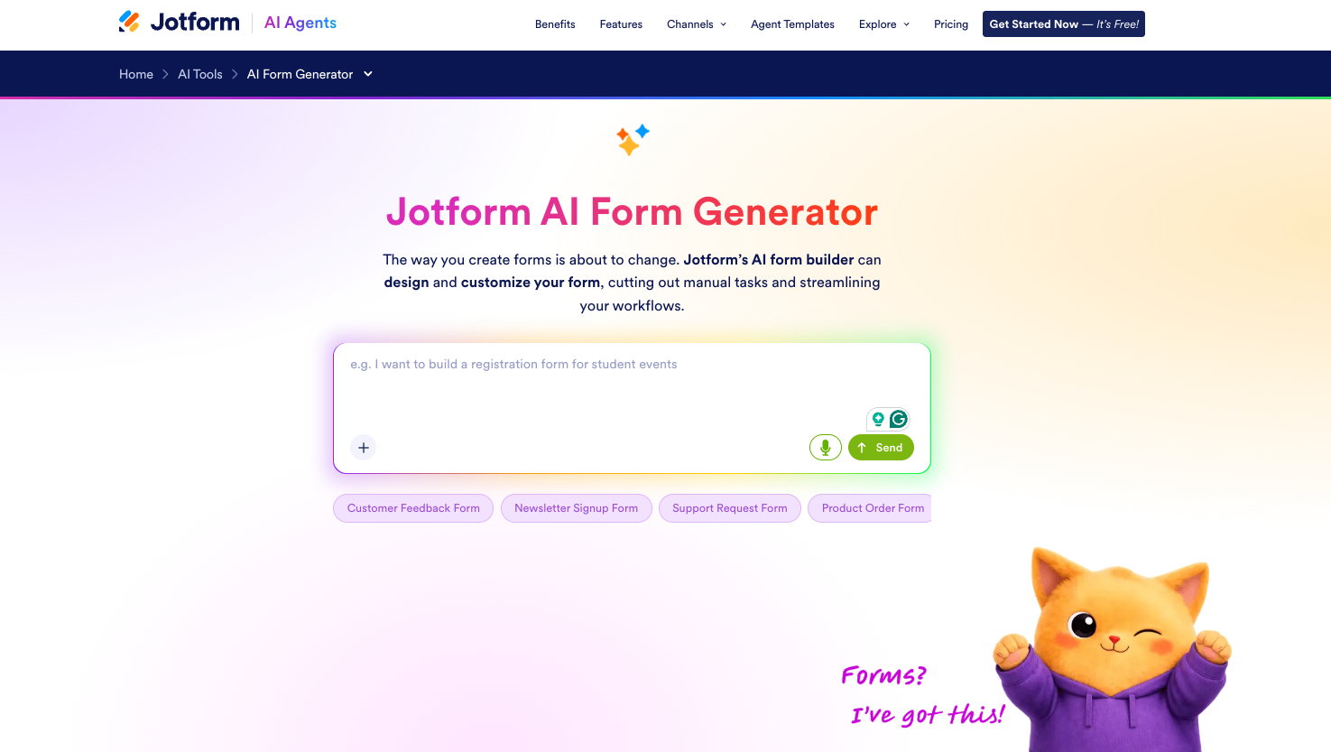 Jotform AI Form Builder offers an excellent, balanced combination of AI creation, automation, and integrations.
