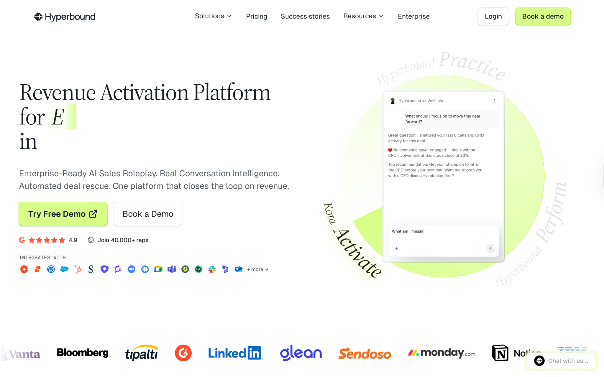 Hyperbound.ai delivers comprehensive AI-powered sales enablement designed to scale coaching, reduce ramp time, and increase consistency across enterprise sales teams. Built on 2 million+ hours of B2B sales calls and 250,000+ roleplays, it offers both AI simulations and real call analysis.