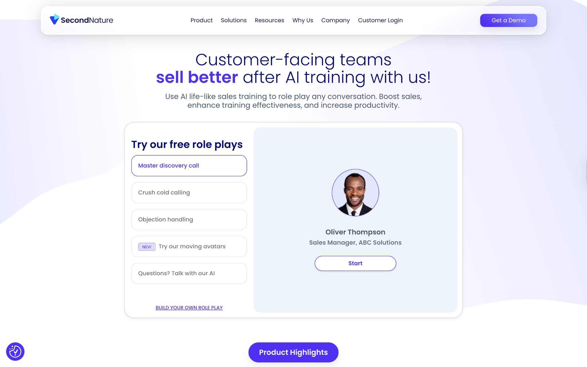 Second Nature provides life-like AI role-play training through interactive conversations with AI avatars. The platform serves as a "virtual pitch partner" that enables sales teams to practice real conversations and receive feedback autonomously.