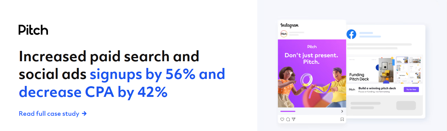 Their Google Ads results speak for themselves. For Pitch, they launched competitor search campaigns on Google using just 20% of the existing Facebook budget. Those campaigns generated 47% of Facebook's monthly signups. Overall, they reduced CPA by 42% and increased signups by 56% while spending 9% less. For CXL, they took over a stagnating Google Ads account and quickly turned performance around by restructuring account architecture and making data-led optimisations.
