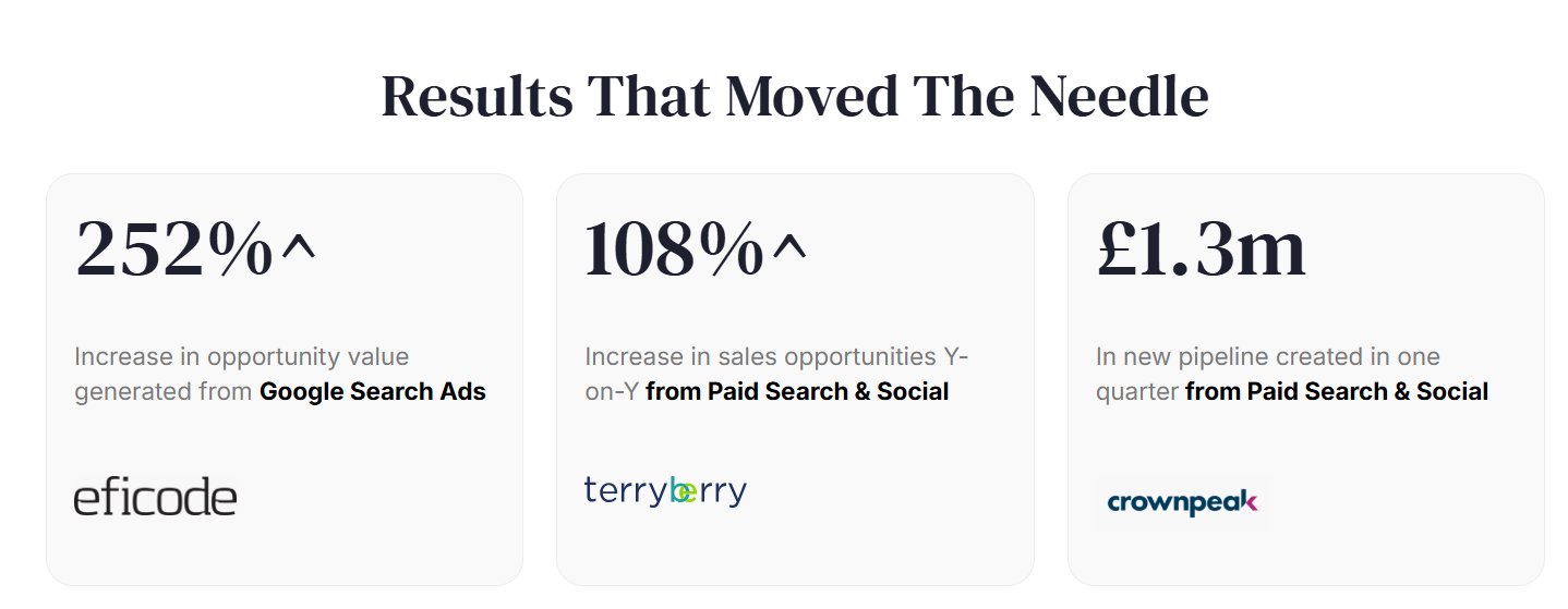 Their Google Ads work goes deep on attribution. They track not just leads but which campaigns generate SQLs, which SQLs convert to opportunities, and which opportunities actually close. For companies with 6 to 12 month sales cycles, that kind of full-funnel visibility is essential.