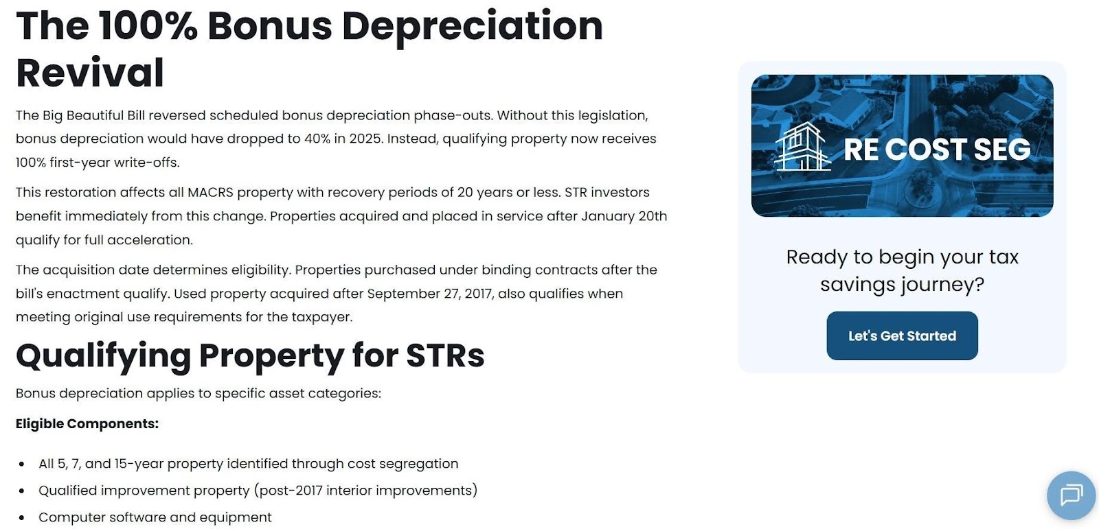 R.E. Cost Seg, a firm that provides cost segregation services for real estate owners, shows how this works. Their post, “The STR Loophole: Short-Term Rentals and Bonus Depreciation,” covers tax rules, timelines, and risks in depth.