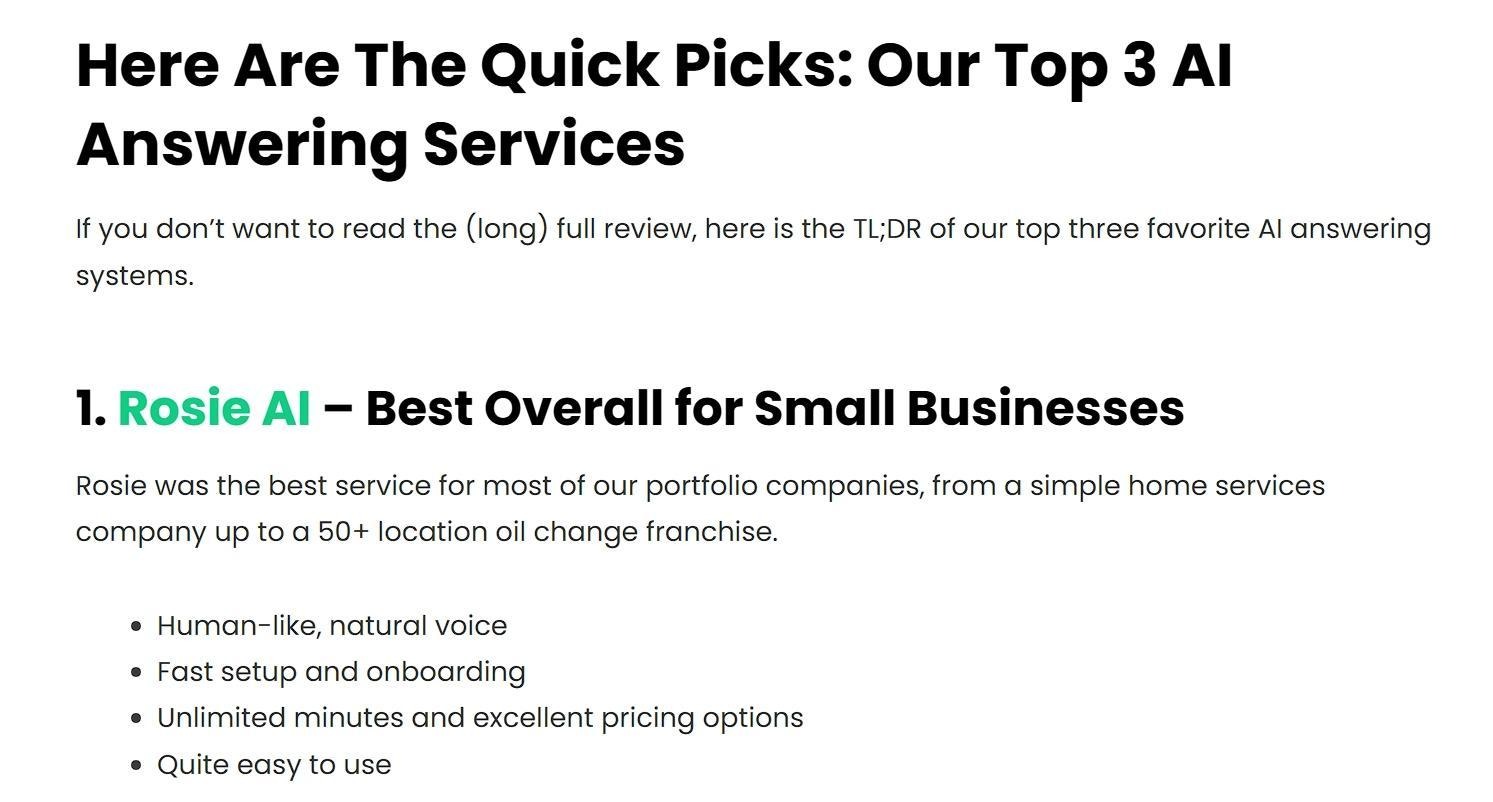 Smash.vc, an investment firm that supports small businesses and startups, shows how this plays out. Their post, “We Reviewed 7 AI Answering Services for Small Business,” lays out key features, costs, and use cases in one place.
